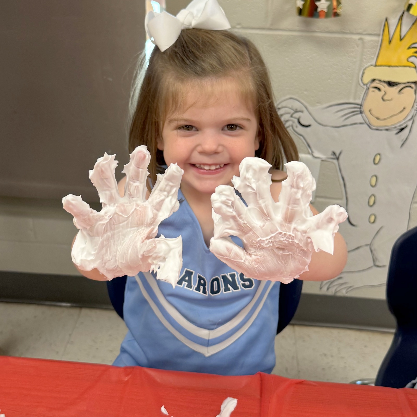 Preschool 3 students enjoyed The Kissing Hand, the heartwarming story of Chester the raccoon who overcomes his first-day jitters when his mother kisses his hand so he can always carry her love with him. To bring the story to life, students had a heart drawn on their hand, a sweet reminder that whenever they feel scared, they can look at their hand and remember their mother’s love.