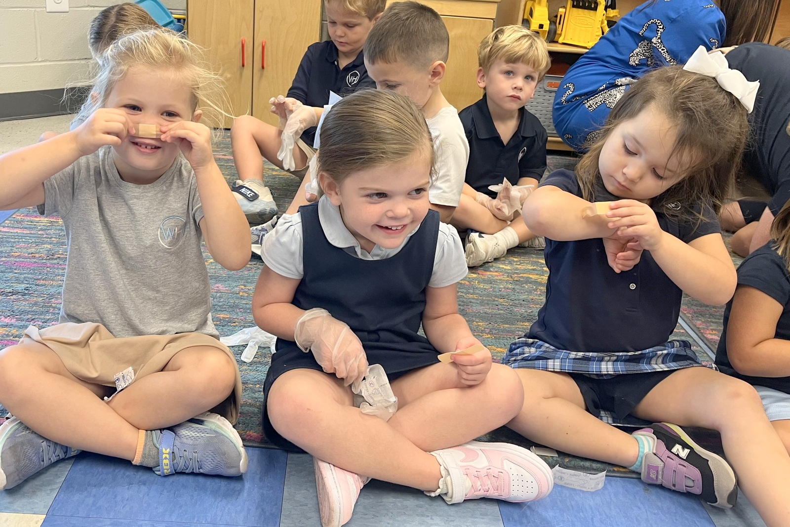 Preschool 3 welcomed Mrs. Allyson Sanders, school nurse, as part of October’s study of community helpers, and she turned health care into hands-on learning. After unpacking her medical bag and sharing her passion for nursing, she read a story about germ prevention, modeled proper hand hygiene, and talked about healthy eating. Students practiced real-world skills by putting on latex gloves, “wrapping” pretend injuries, and bandaging themselves and stuffed “booboos,” discovering how a school nurse helps them feel safe and well at school.