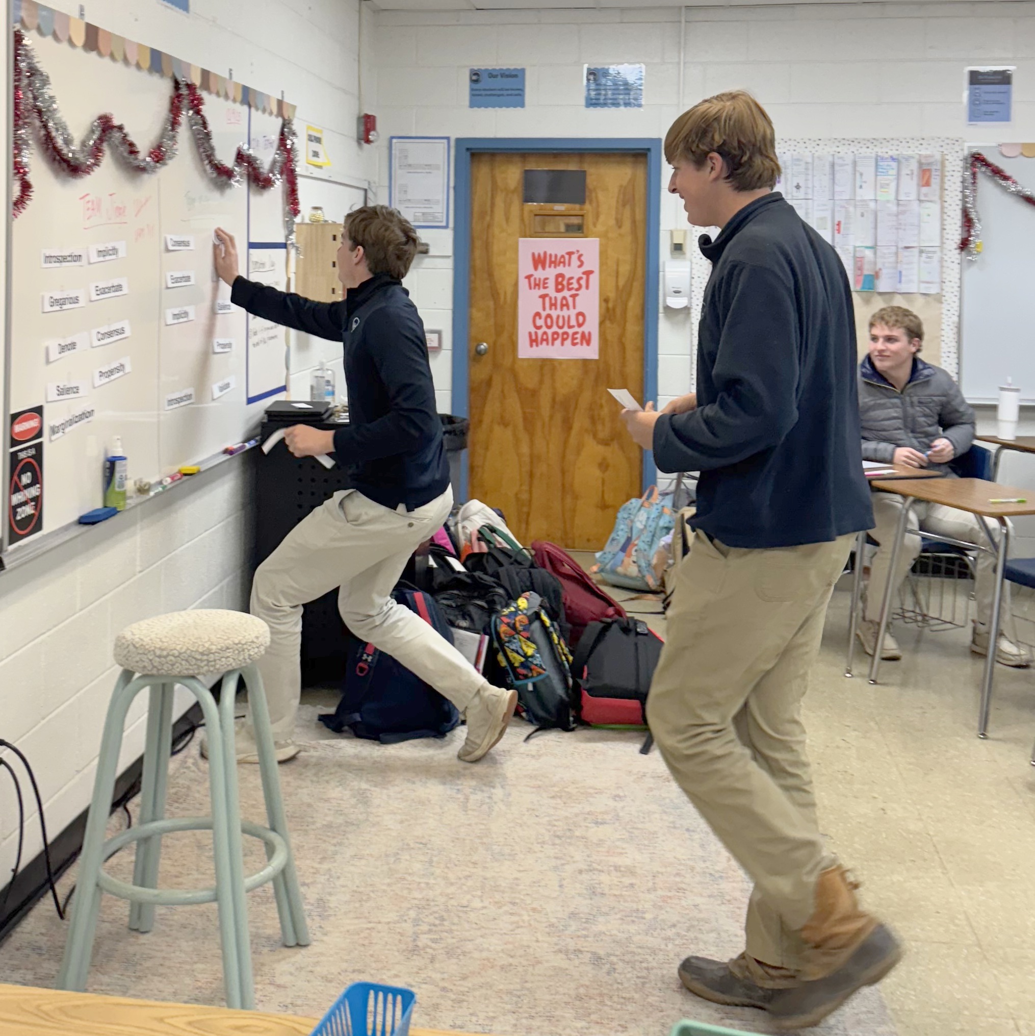 Team Jingle took on Team Bells in a fast-paced vocabulary relay race in Mrs. Ashley Cook’s English 12 class, with students racing to match definitions with the correct vocabulary words. Each team member located their numbered definition, sprinted to the board to choose the right term, and quickly took a seat while Mrs. Cook verified each pairing for points. After a spirited competition, Team Jingle claimed the victory.