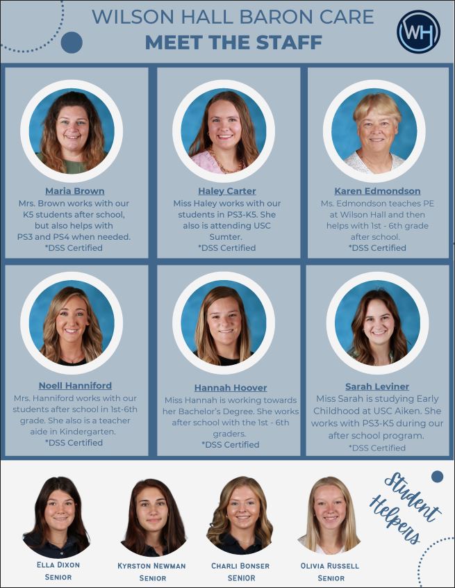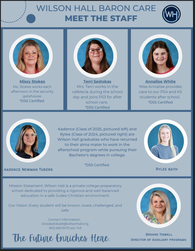 Baron Care is Wilson Hall’s after-school program, serving 177 students from 3-year-olds through sixth grade. Running from dismissal until 6:00 PM, the program is supported by 10 DSS-licensed staff members and four student helpers who create a safe and engaging environment. Students begin with quiet homework time, daily reading, and a snack before enjoying activities that promote collaboration and play. From time on the playground to indoor games, puzzles, crafts, and movies, Baron Care offers children countless opportunities to learn, connect, and unwind each afternoon. For more information, please contact Mrs. Brooke Tidwell, Director of Auxiliary Programs, at brooketidwell@wilsonhall.org.