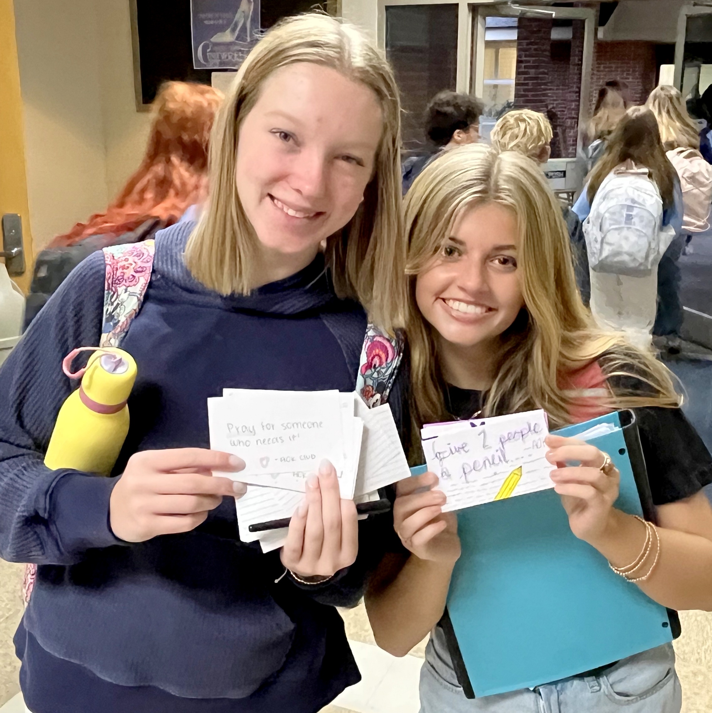 Spreading encouragement across campus, members of the Acts of Kindness Club created and distributed cards to high school students, each featuring a simple act of kindness to complete. From saying good morning to ten people to holding doors, sharing lunch with someone new, or offering compliments, students were encouraged to complete the act and then pass the card along, creating a ripple effect of kindness throughout the school.