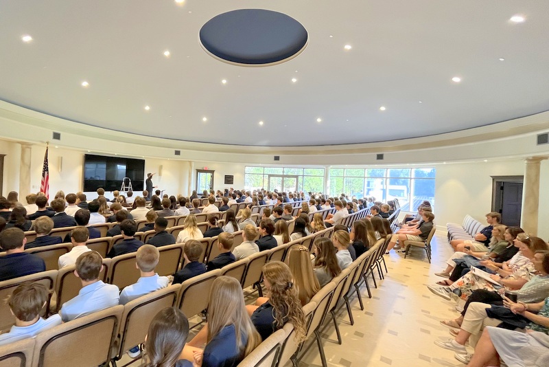 Grounded in Scripture and shaped by moments of quiet reflection, the first Chapel of the school year invited high school students to focus their hearts on the words of Philippians 4:8, which encourages us to meditate on what is true and good. Mr. Lee Gandy, Chapel Program Director, set a thoughtful tone for the year as he introduced Chapel, urging students to develop an appreciation for stillness and quiet in a world often filled with noise. The message was deepened by the words of Jesus, inscribed on the wall of Founders Chapel: “Come away by yourselves to a quiet place and rest for awhile” (Mark 6:31). With gratitude for the beauty and sacredness of this chapel, the service closed in prayer, reminding all present of the importance of beginning the year grounded in faith and reflection.