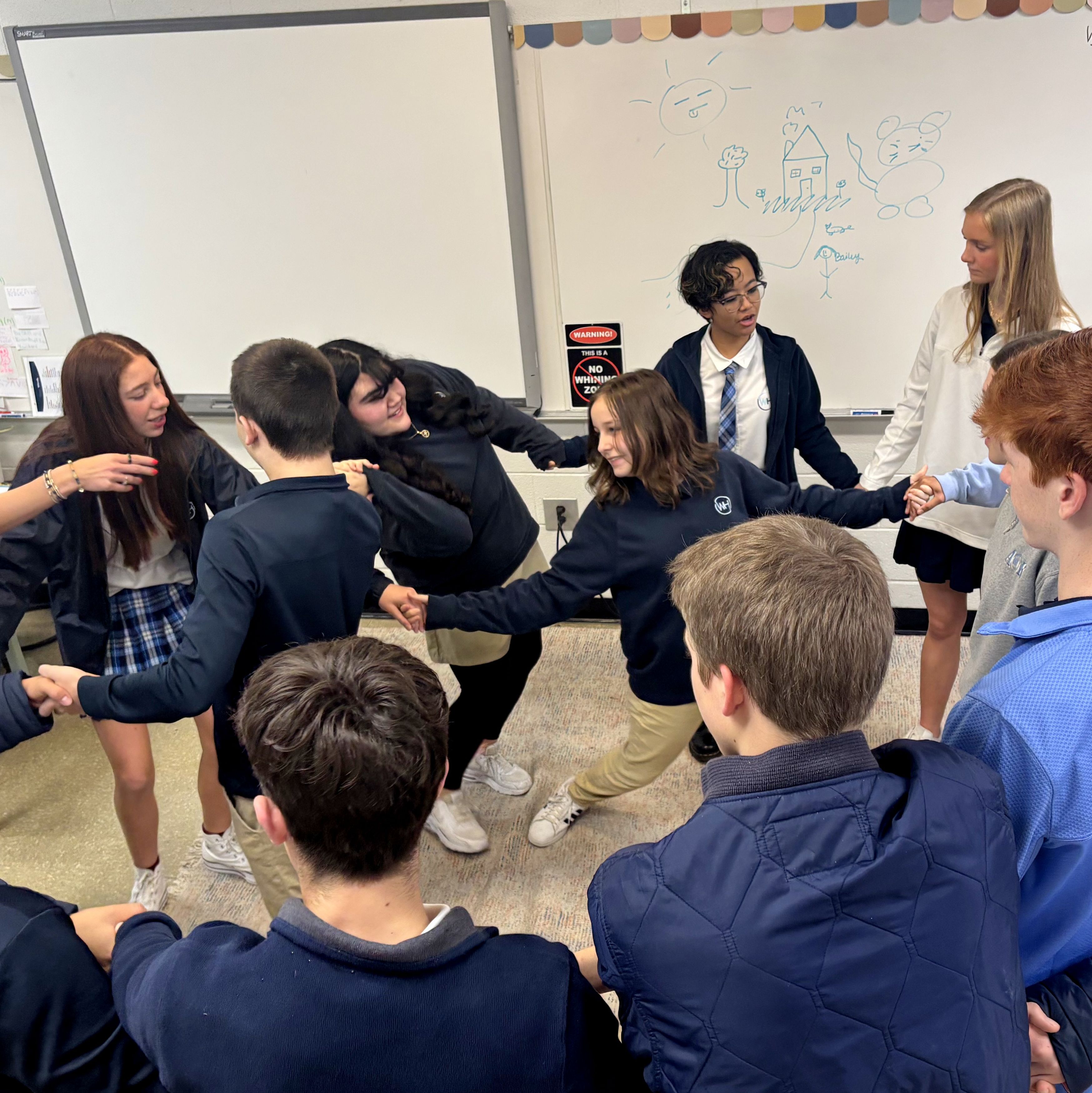 Building relationships and strengthening community, high school students took part in a Connect activity that encouraged teamwork, creativity, and communication. During Wilson Hall’s small group advisory program, students participated in a Group Drawing Relay, where each person added to a shared artwork, and the Human Knot challenge, working together to untangle themselves into a circle, reinforcing the value of cooperation and shared problem solving.